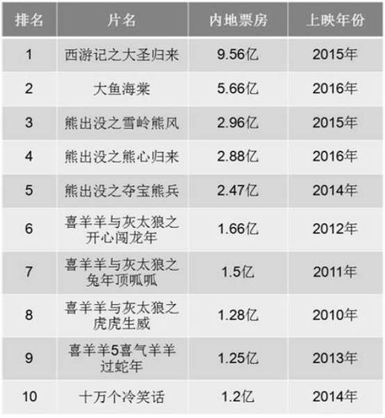 2016年票房排名前十的动画电影里,《功夫熊猫》、《熊出没》、《大头儿子和小偷爸爸》等片本身已经具有一定的IP影响力,又有东方梦工厂、光线、乐视、央视等巨头参与,均取得了不错的票房成绩。