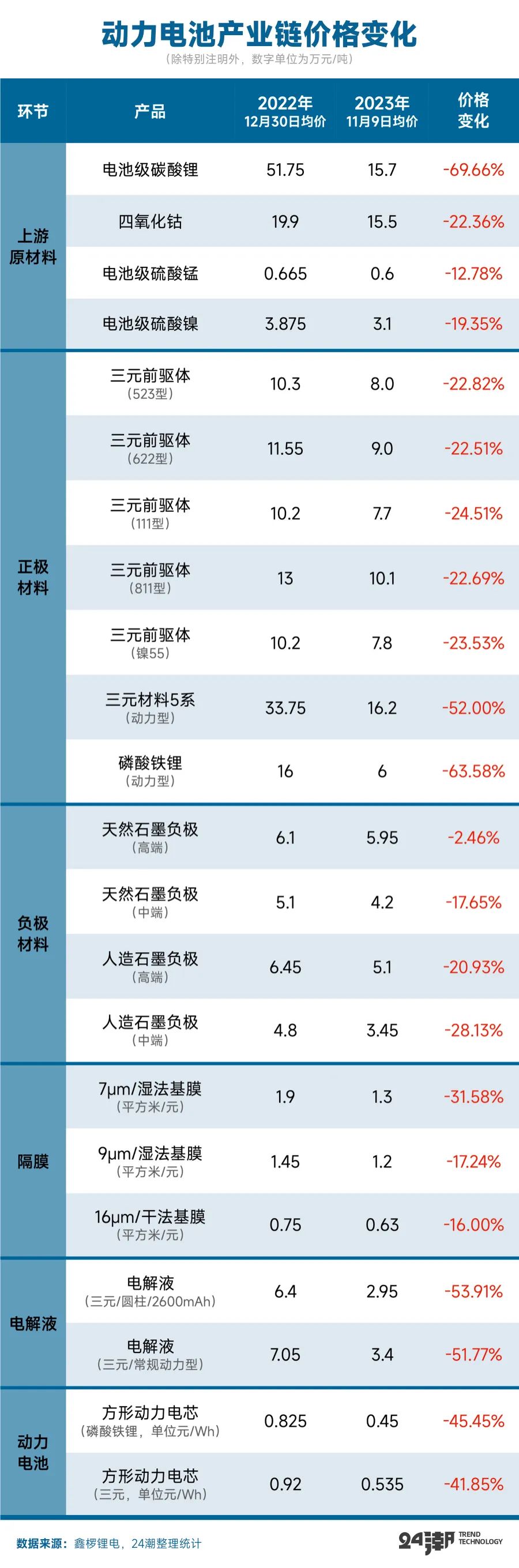 如下表所示,2023年初至今,动力电池产业链价格全线下跌,其中动力电池价格跌幅超40%。