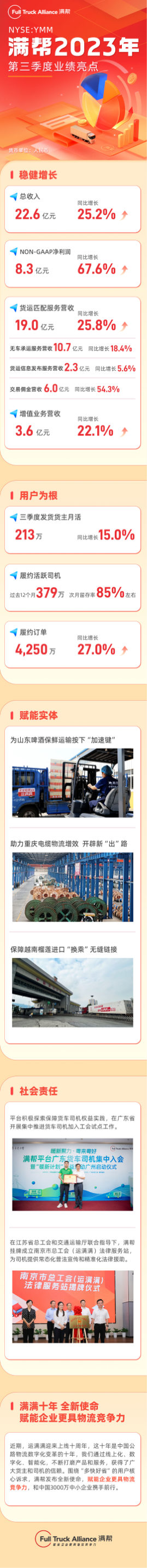 11月20日,数字货运平台满帮集团(YMM.US)于美股盘前发布了2023年第三季度财报,财报显示,本季度满帮营收规模和净利润再创新高,各业务板块均实现全面增长。