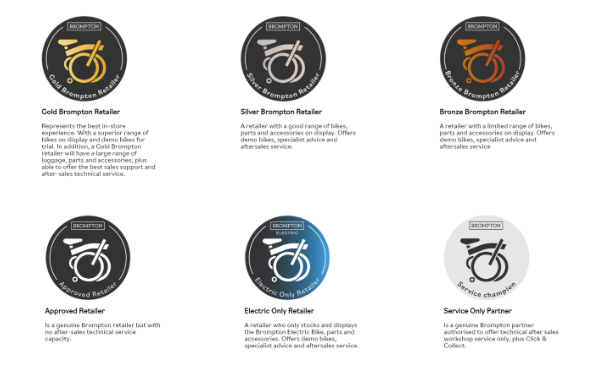 在官网,根据产品和服务的丰富度,Brompton 把零售商分为 Golden、Sliver、Bronze、Approved、Electric Only、Service Only 六大类。