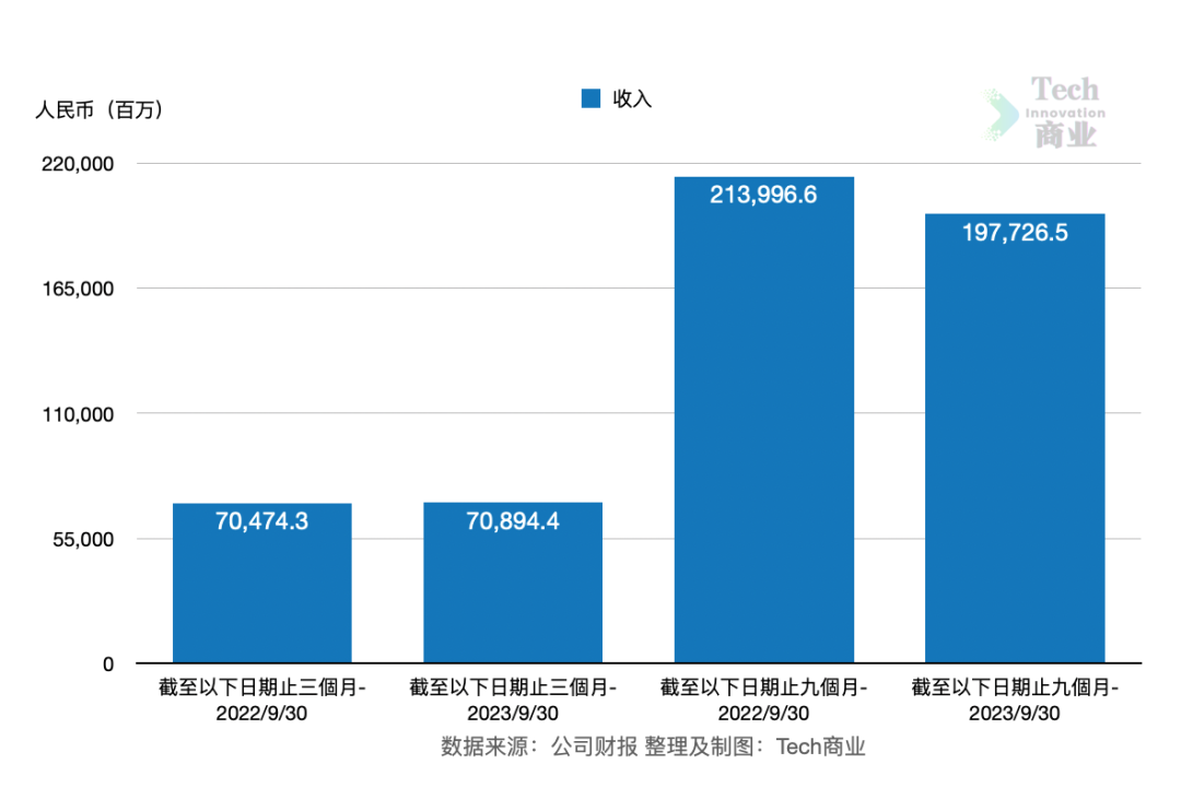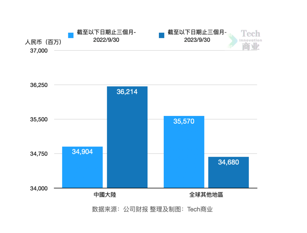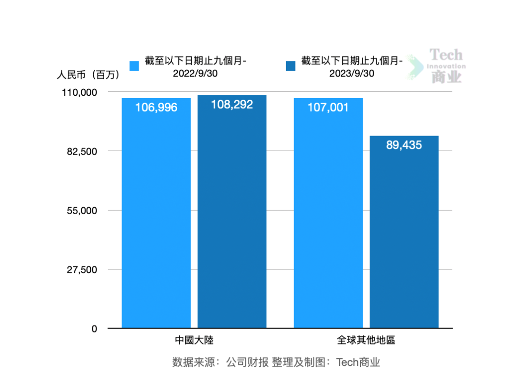 前九个月来自中国大陆地区的收入为1083亿元,上一财年同期为1070亿元,该期大陆地区收入增长1.2%。来自全球其他地区的收入为894亿元,相较上一财年同期的1070亿元,该地区收入同比减少16.4%。