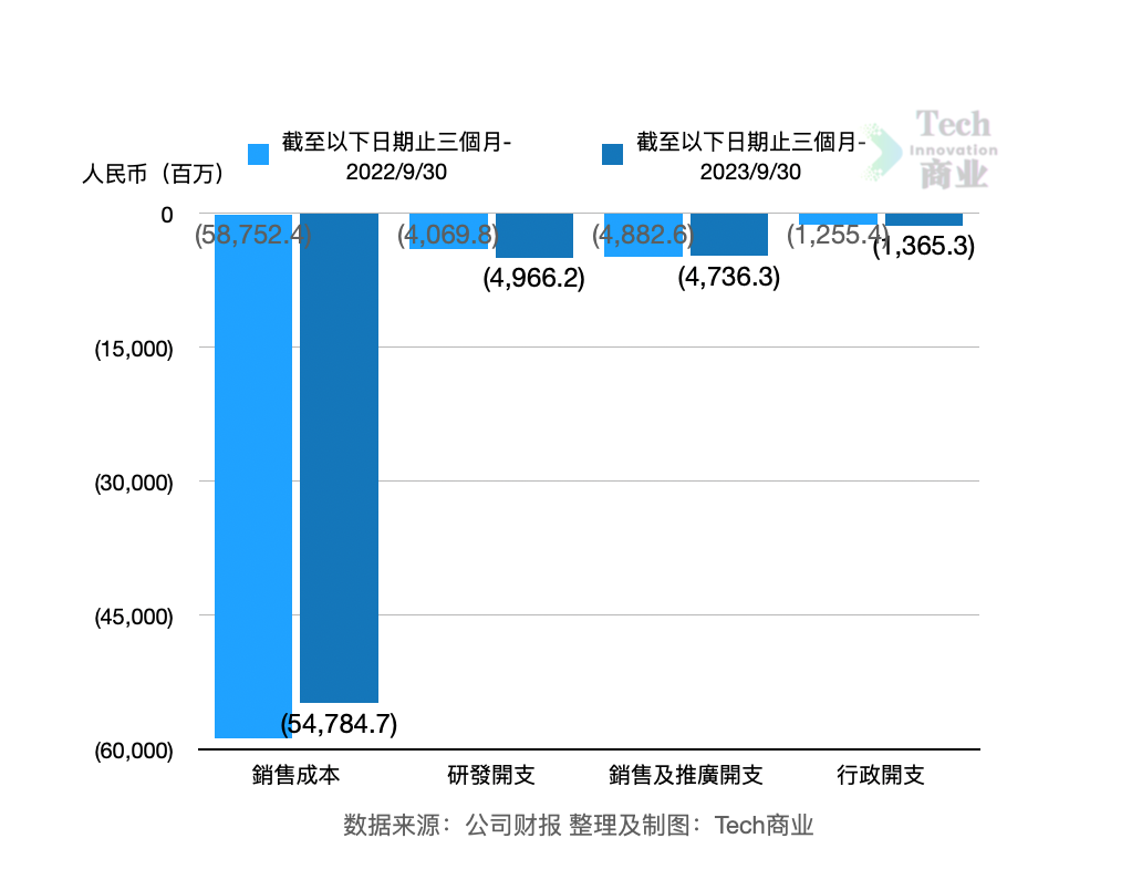 本季度小米公司销售成本为548亿元,相较上一财年Q3的588亿元,本季度该成本减少6.8%。Q3研发开支为49.7亿元,相较上一财年同期的40.7亿元,本季度该开支增幅为22%。本季度销售与推广开支为47亿元,相较上一财年同期的49亿元,该开支减少3%。Q3研发开支为14亿元,相较上一财年Q3的13亿元,该开支增幅为9%。