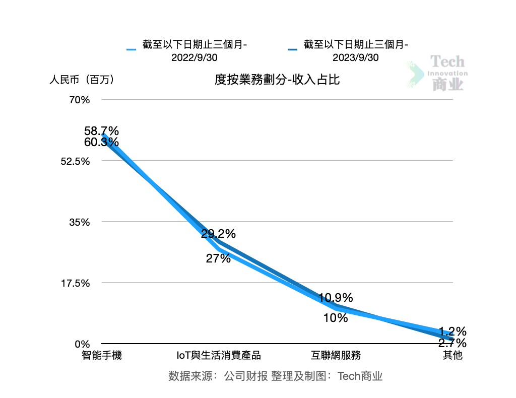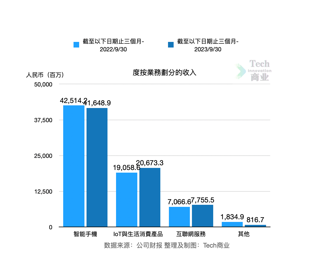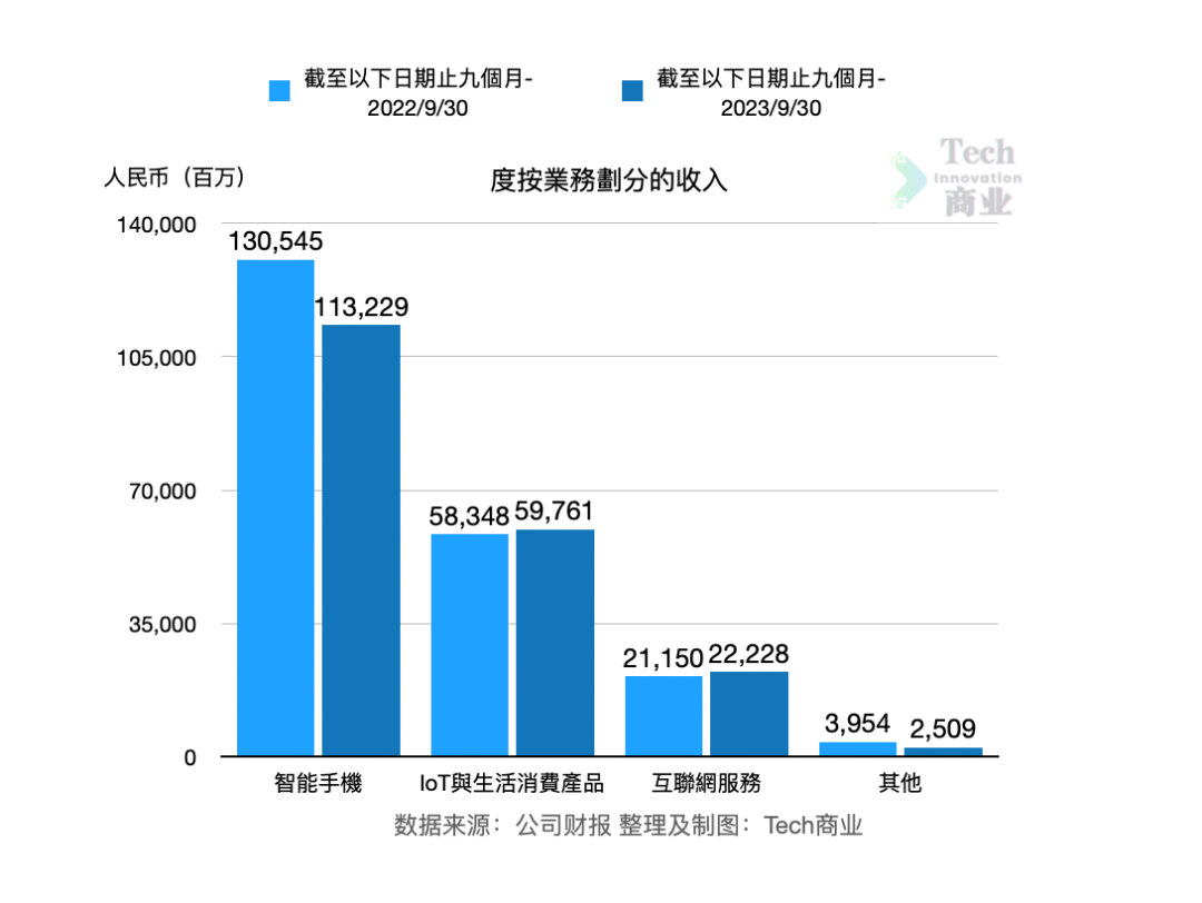 即本财年前九个月,小米公司IoT与生活消费产品、互联网服务收入同比有所增长,智能手机、其他业务收入同比有所下降。