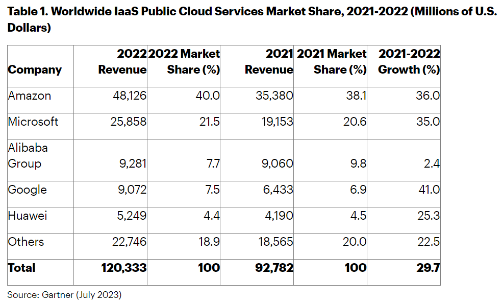 排名确实靠前,但 IaaS 市场有个断层的特点。市场研究机构Gartner数据显示,亚马逊AWS和微软Azure的市场份额分别是40%和21.5%,而排名第三的阿里云,仅有7.7%。从2022年的收入来看,也是如此。AWS超过480亿美元,Azure接近260亿美元,阿里云是92.8亿美元。