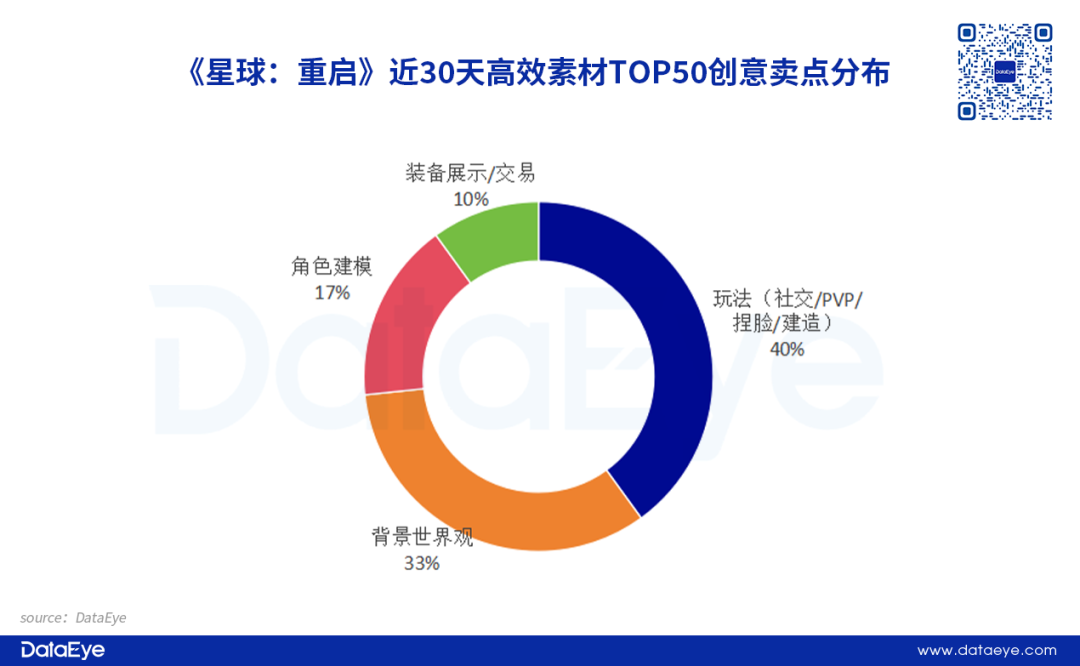 《星球:重启》高效素材的玩法相关要素占比最高,其中包括突出社交/PVP/建造家园以及捏脸等玩法,吸引对相关内容感兴趣的玩家。