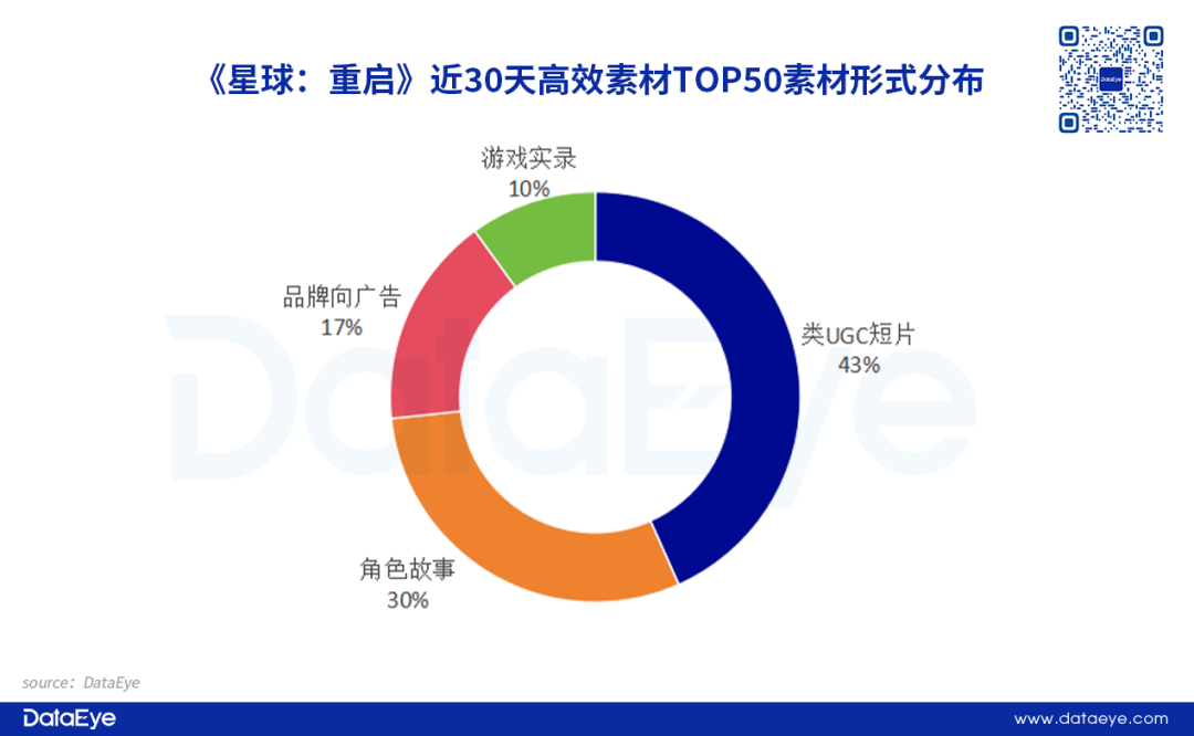 从创意形式来看:《星球:重启》高效素材TOP50的素材创意形式分为4个方向:类UGC短片、角色故事、品牌向广告以及游戏实录。其中“类UGC广告”占比最高,而品牌向广告占比17%。