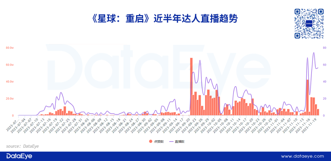 达人直播营销方面,《星球:重启》的相关达人内容集中于在产品上线前后:一方面是采买达人内容集中发布;另一方面项目组在11月15日上线“抖音游戏发行人计划”。