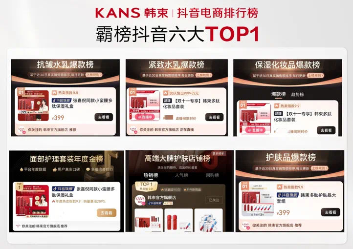 官方数据显示,韩束前三季度在抖音GMV达到17.71亿元,多次霸榜抖音美妆销量月榜第一,红蛮腰系列销量超290万套。