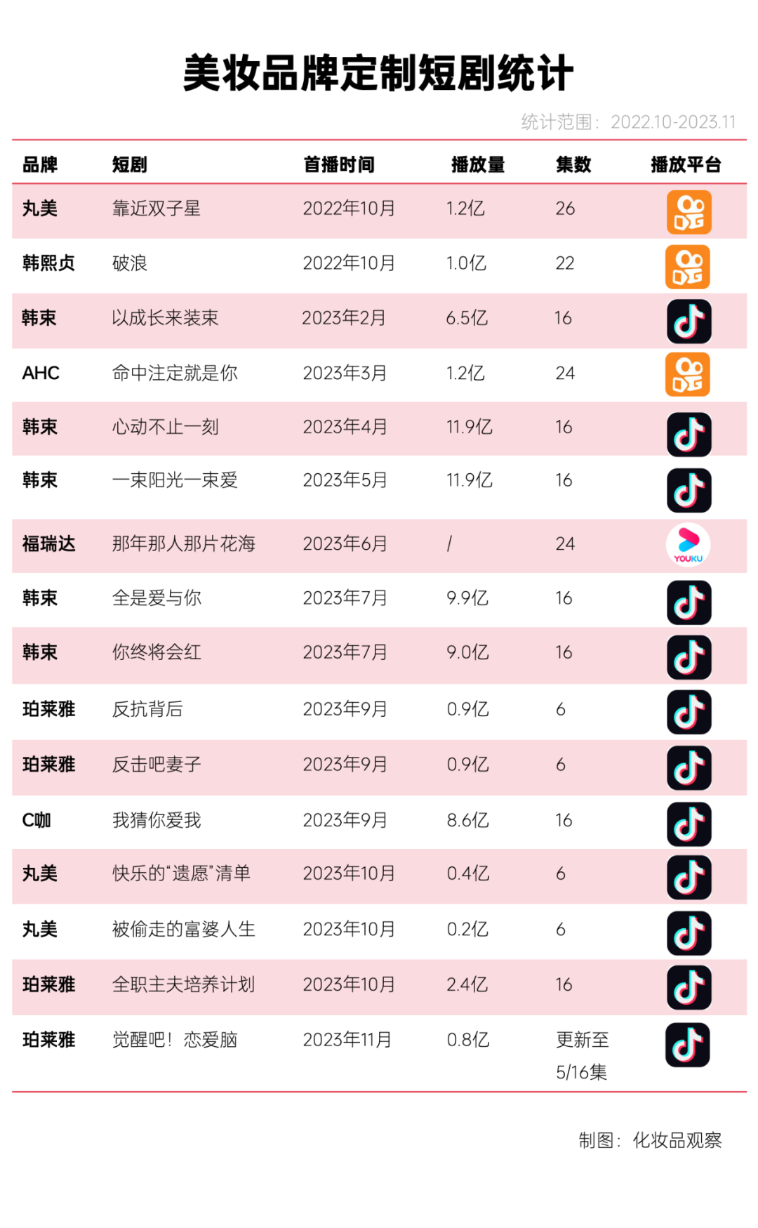 其他品牌也纷纷闻风而动。据《化妆品观察》统计,近一年至少有16部为美妆品牌量身打造的短剧上线,其中丸美、韩束、珀莱雅三个品牌就制作了12部。