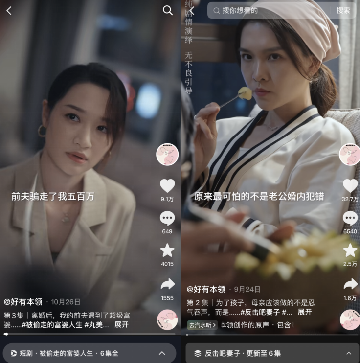 人性最大公约数的机制下,也难怪我们在短剧中看到了铺天盖地的“老公出轨”“屌丝逆袭”“恶婆婆遭殃”等戏码。