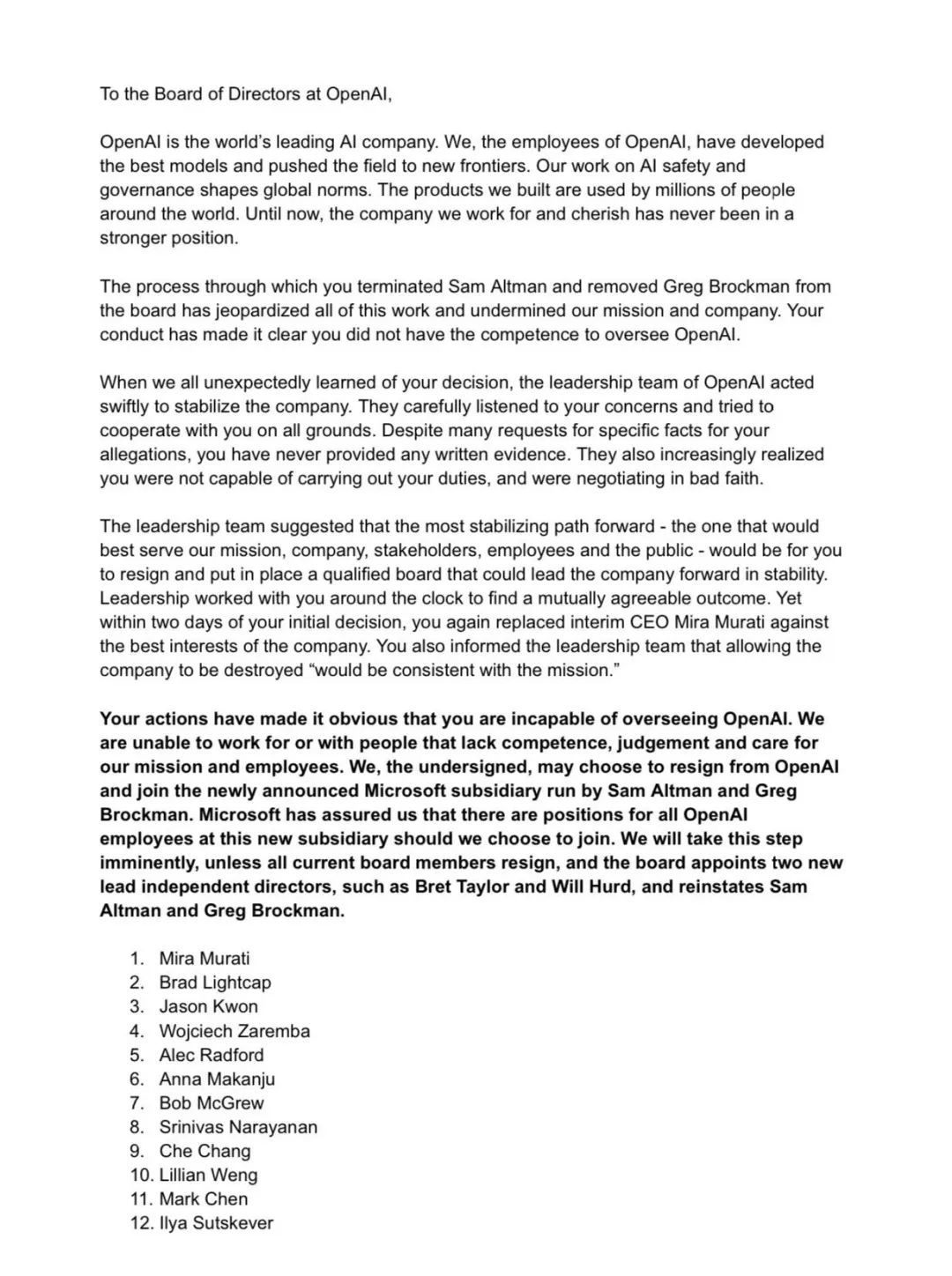 同时,伊利亚确实也实现了他的承诺,因为,他是第十二个签署该公开信的。不仅如此,他还发表了强硬的声明,表示如果董事会不收回决议,他将辞职。毫不夸张的说,伊利亚一旦辞职,OpenAI很可能也将因此画上句号。