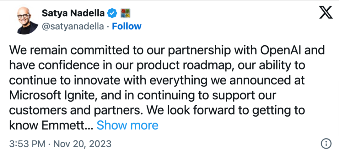 既不能放奥特曼单飞,又临时在微软找不到合适位置,逼得纳德拉最终在11月20日,发文表示“先让奥特曼来微软,负责一个新的高级人工智能团队”。
