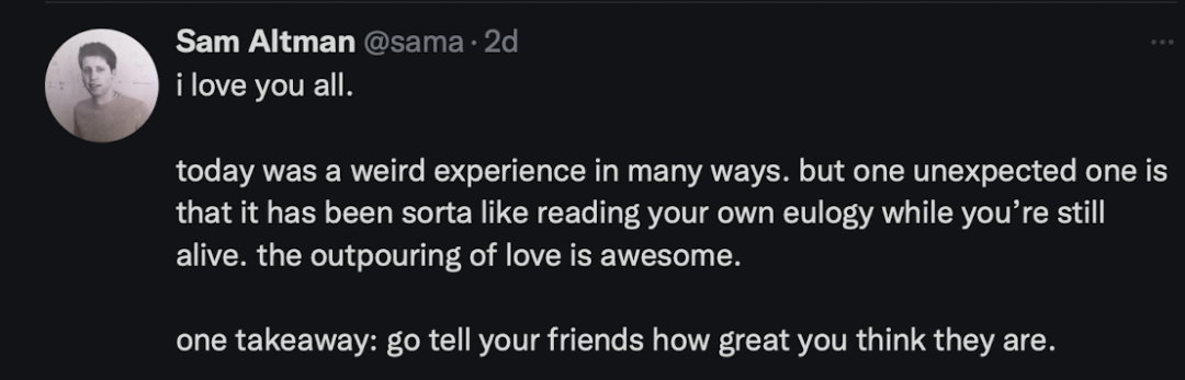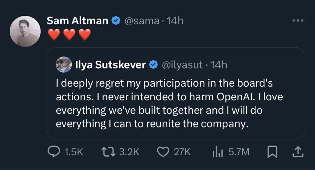 显然董事会没有预料到这样的结果,以至于伊利亚被迫无奈站出来公开道歉,表示无意伤害公司(指大量员工尤其是核心人员离职),并将倾其所有让公司团结起来。