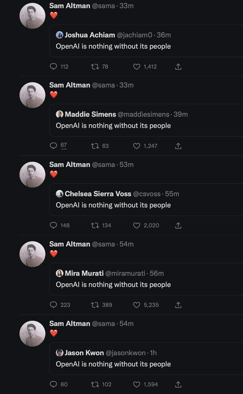 而被任命临时顶替奥特曼职位的现任CTO米拉,随后发布了一条只有一句话的动态“没了自己的人民,OpenAI啥也不是”,表达对本次决策的不满。在米拉的带头下,OpenAI团队十多名成员集体发布同样的内容,奥特曼进行转发并附上了❤️。