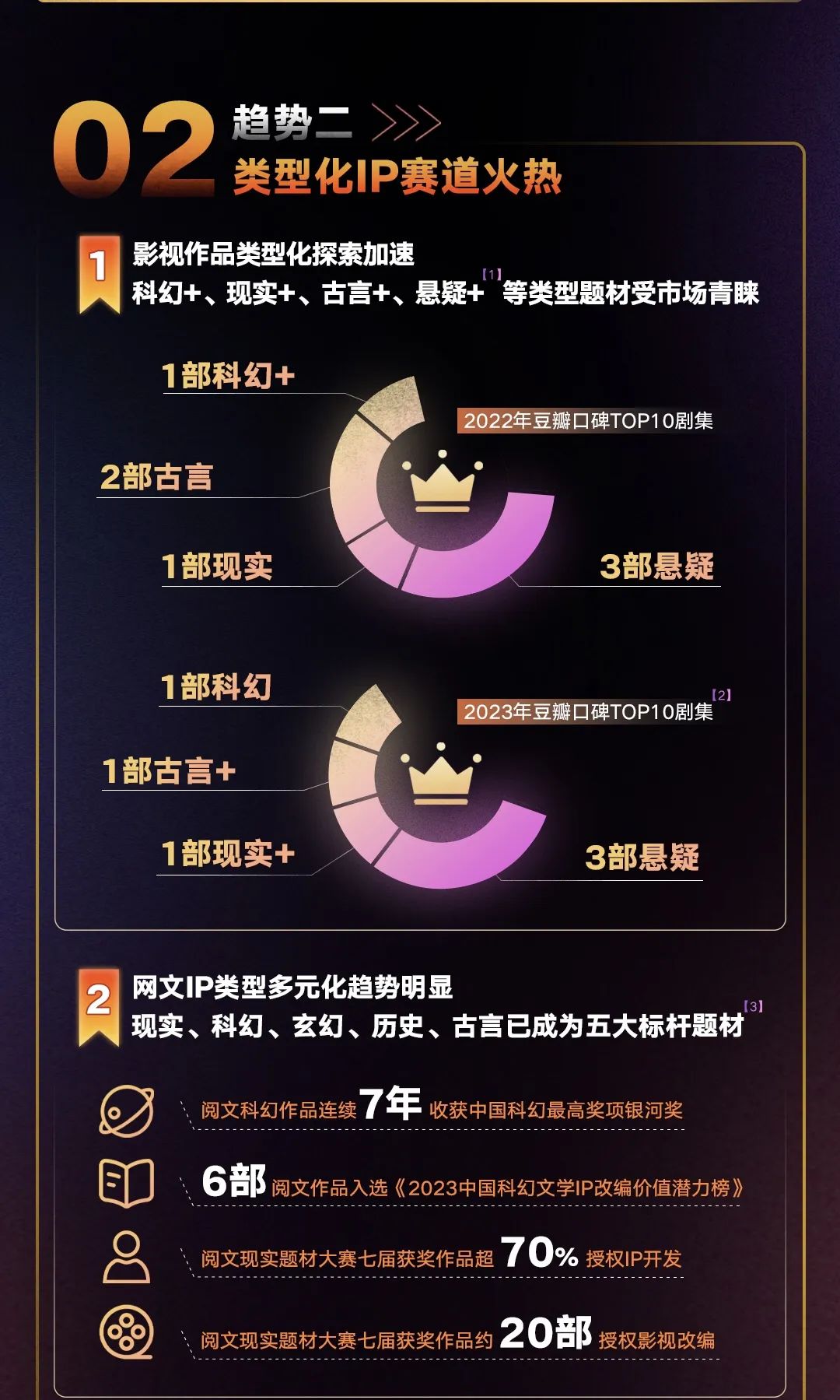 如《IP风向标》指出,类型化IP赛道呈现火热趋势,影视作品类型化探索加速,许多作品都融入了悬疑、科幻、古言等元素。