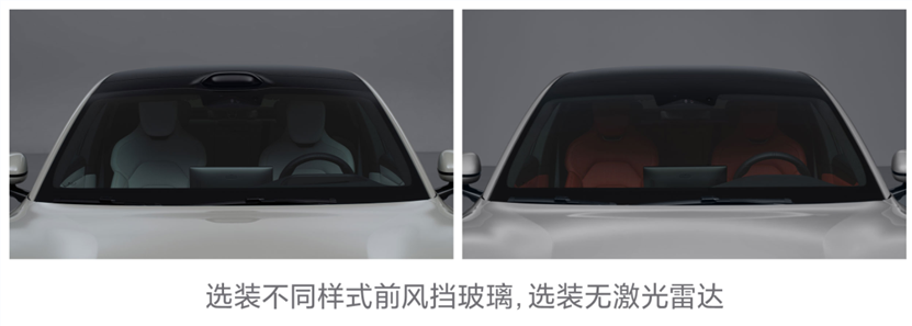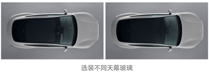 从官图来看,一款天幕的颜色较深,一款天幕颜色较浅。我猜测,可能一款是不可变色,一款能变色。可变色的那一款呈现出了很强的磨砂质感,应该用的是电质变色玻璃。