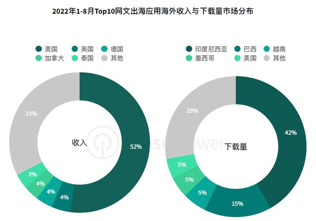 据Sensor Tower数据显示,2022年1-8月收入排名前十的中国网文应用总收入超过1.3亿美元,其中美国市场收入占比达到52%,是最重要的收入来源之一。