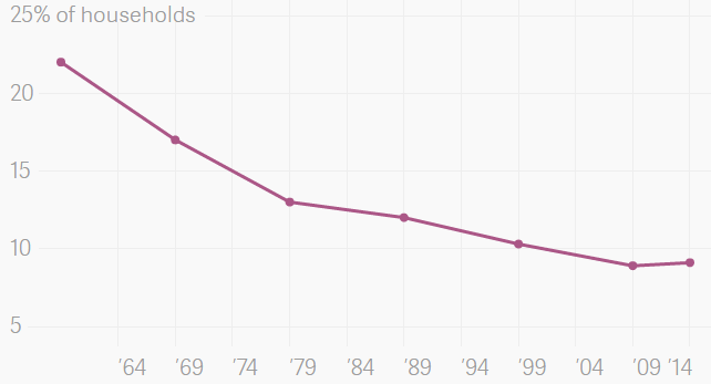 自美国人口普查局1960年开始统计这一数据以来,美国无车家庭的占比在几十年间持续下滑。一个原因在于,以汽车为主的交通规划使得汽车越来越成为必需品。