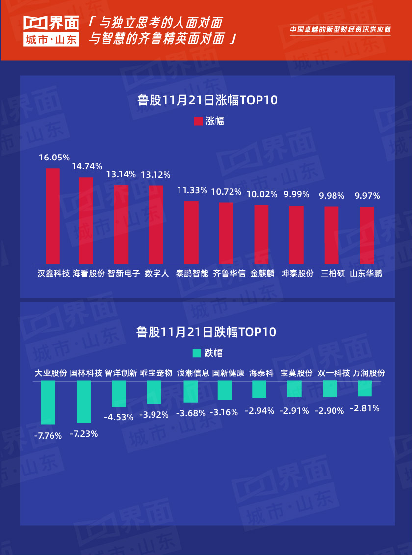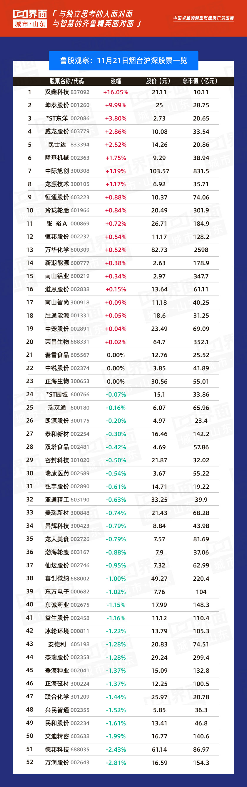 烟台市涨幅榜首:汉鑫科技(837092),涨幅16.05%,股价21.11元,总市值10.11亿元;