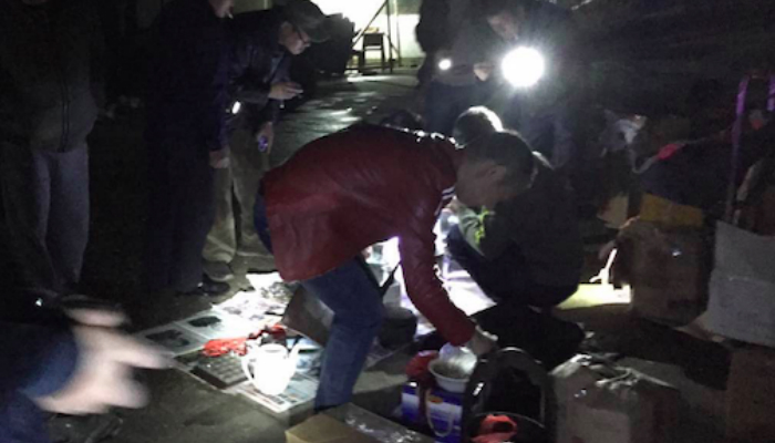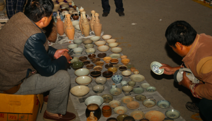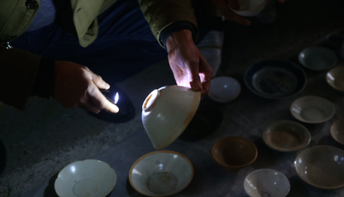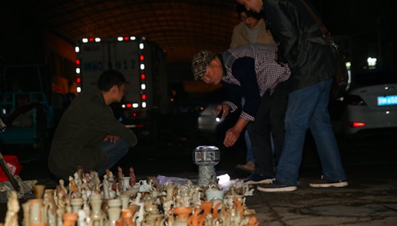 4:28,鬼市的手电筒灯光逐渐多了起来,淘客们一手拿手电筒,一手拿着古瓷,认真仔细地看个遍。