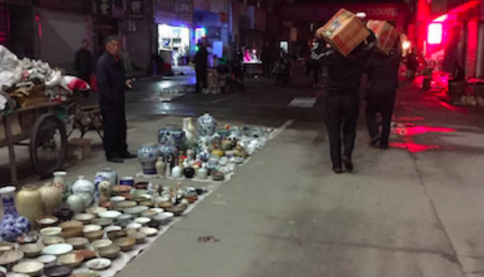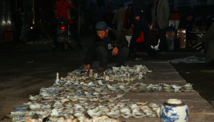 5:46,卖瓷片的人陆续多了起来,走在鬼市里面,随处可以听到“哗啦哗啦”倒瓷片的声音。