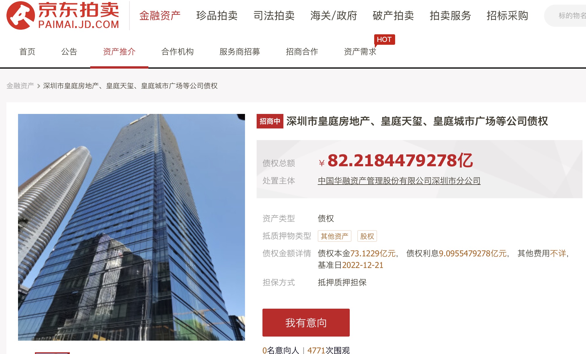 据京东拍卖页面显示,中国华融资产管理股份有限公司深圳市分公司及相关主体,拟对拥有的深圳市皇庭房地产开发有限公司、深圳市皇庭天玺房地产开发有限公司、深圳市皇庭城市广场开发有限公司债权资产在京东拍卖网站上进行公开挂牌处置。
