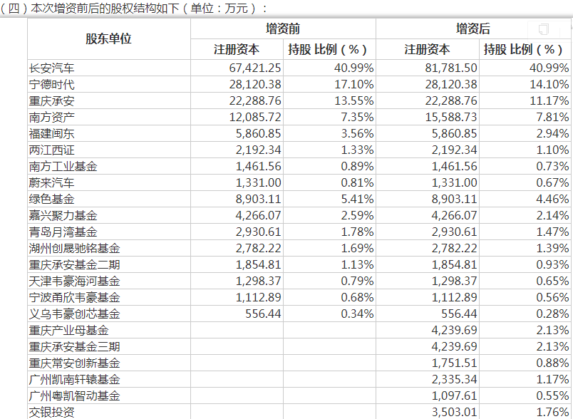 另一边,长安汽车联营公司重庆长安新能源汽车科技有限公司2022年3月也完成增资扩股及引入新投资者,该次增资完成后,长安汽车对其的持股比例由48.95%减少至40.66%。重庆长安新能源汽车科技有限公司后更名为深蓝汽车科技有限公司(以下简称“深蓝汽车”)。