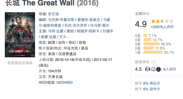 发一个《长城》在豆瓣上的实时评分: