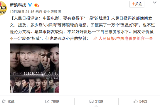 人民日报评论部晚间发文,提及,多少靠“小鲜肉”等博眼球的电影,即便买了一万个“五星好评”,也不过是沦为笑柄。与其跟网友较劲,不如好好反思一下自己态度或水平。网友评价虽不一定就是“权威”,但也是观众心声的投射