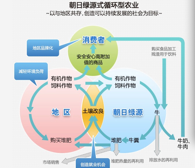 在成立之初,朝日绿源的目标利用牛粪的堆肥不依赖化学肥料等维持地力的“循环型农业”,在2008年成立了乳业公司之后,将奶牛养殖也加入了这个循环农业的链条,并在其官网给出了示意图。