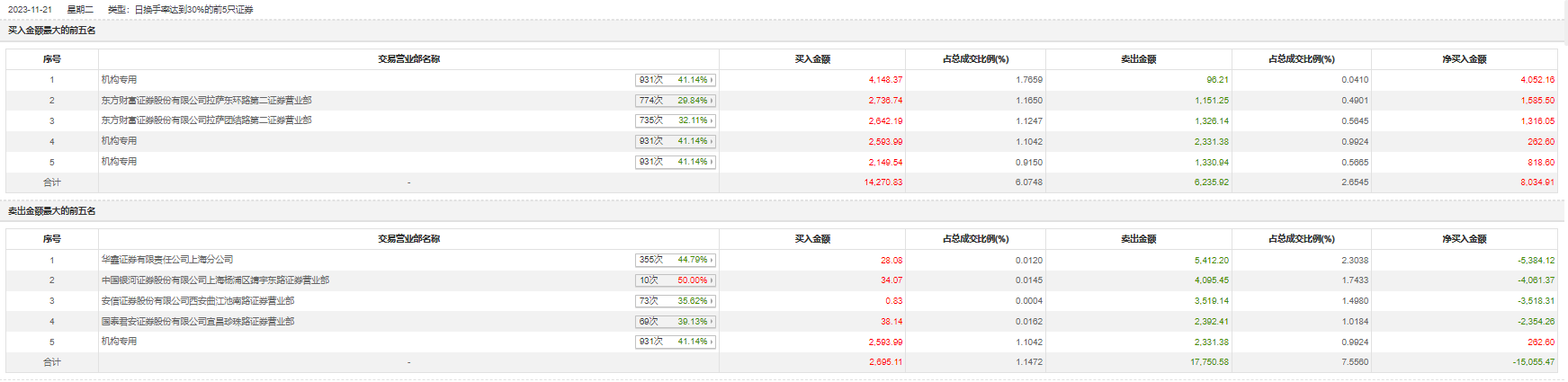 11月21日,赛为智能今日涨11.3%,全天换手率达48.14%,振幅达15.27%。龙虎榜数据显示,营业部席位合计净卖出7283.16万元。其中,机构买入8891.89万元,卖出3758.53万元,合计净买入5133.37万元。此外,东方财富证券拉萨东环路第二证券营业部、东方财富证券拉萨团结路第二证券营业部分别买入2736.74万元、2642.19万元;华鑫证券上海分公司、中国银河证券上海杨浦区靖宇东路证券营业部分别卖出5412.20万元、4095.45万元。