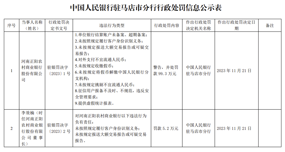 11月21日,中国人民银行驻马店市分行行政处罚信息公示表显示,2023年11月21日,河南正阳农村商业银行股份有限公司被警告,并处罚款99.3万元。违法行为类型为:1.单位银行结算账户未备案、超期备案;2.未按照规定履行客户身份识别义务;3.未按规定报送大额交易报告或可疑交易报告;4.对外支付不宜流通人民币;5.未按规定收缴假币;6.未按规定将假币解缴中国人民银行分支机构;7.未按规定挑剔不宜流通人民币;8.征信用户报备不及时、不规范,违反安全管理要求;9.提供虚假统计报表。
