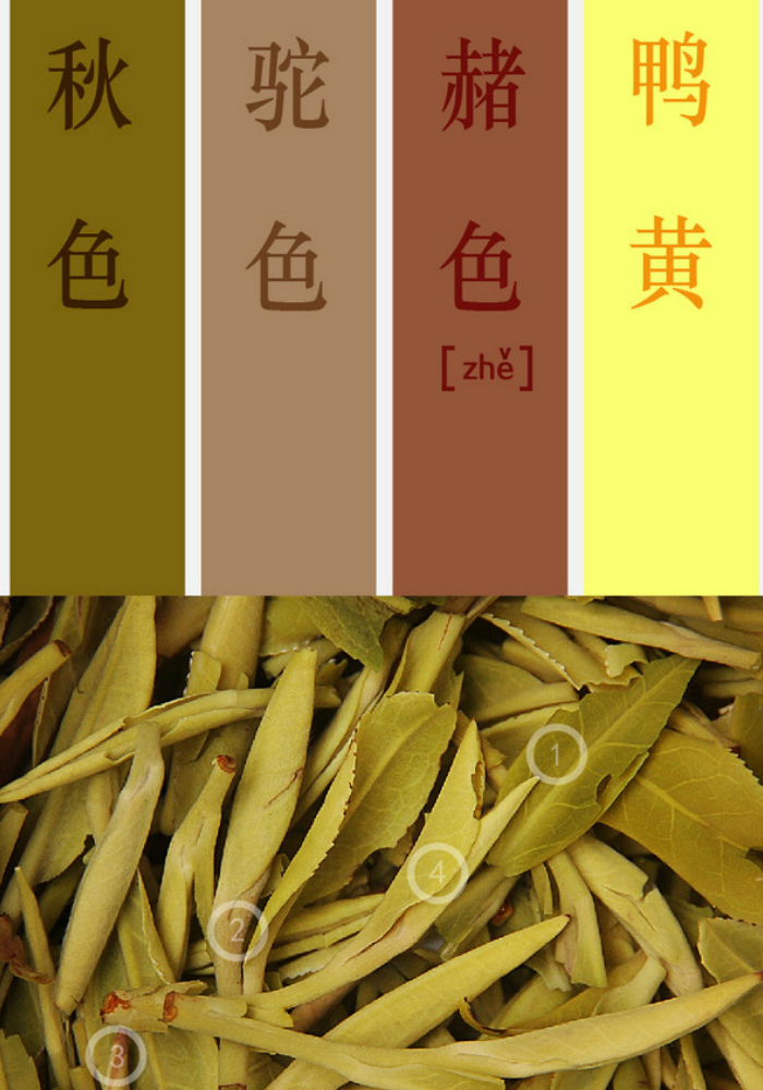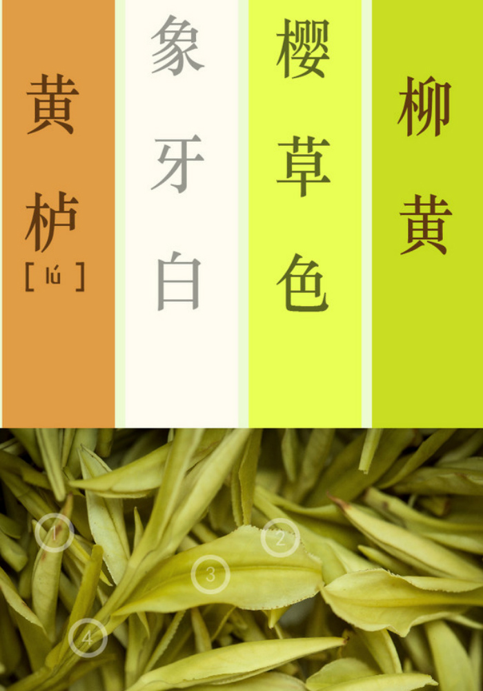 鸭黄:明亮而鲜艳,多为黄茶外表的颜色。
