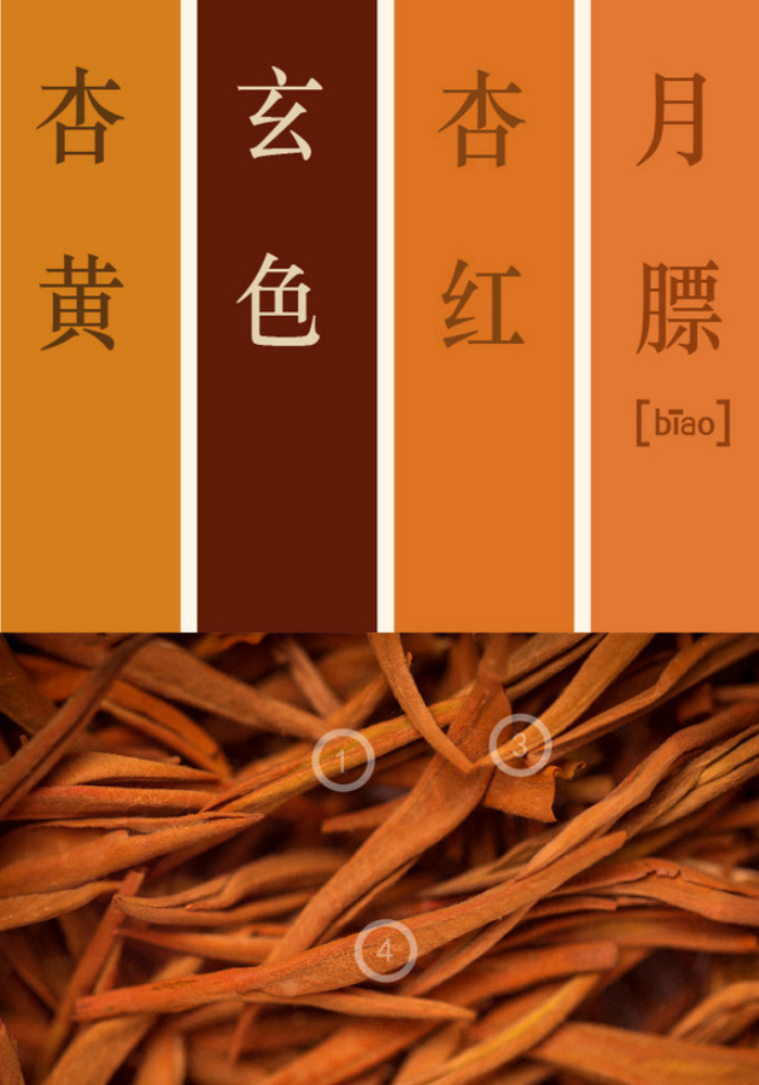 取色:乍一看红茶的色调就是一片红而已,通过区分才发现,同样的红色调,被分出了杏黄、杏红、月膘三种梯度,毕竟每一片茶叶都是独一无二的存在。