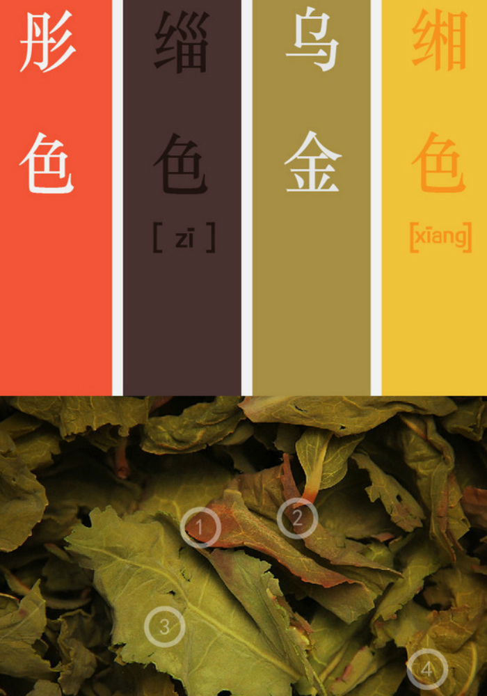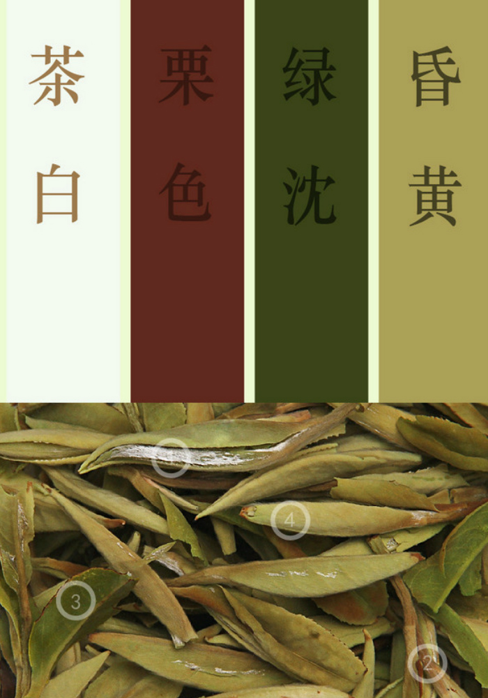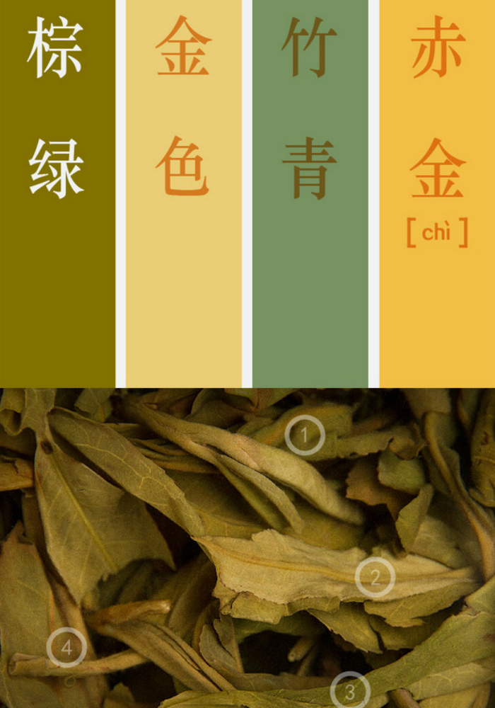 按照标注出的圈圈①~④,就是色谱上从左往右所指的颜色。有了这个茶叶色谱,以后对描述叶底的颜色时,大家就可以换上这些词了,更加准确不说,也更加专业。