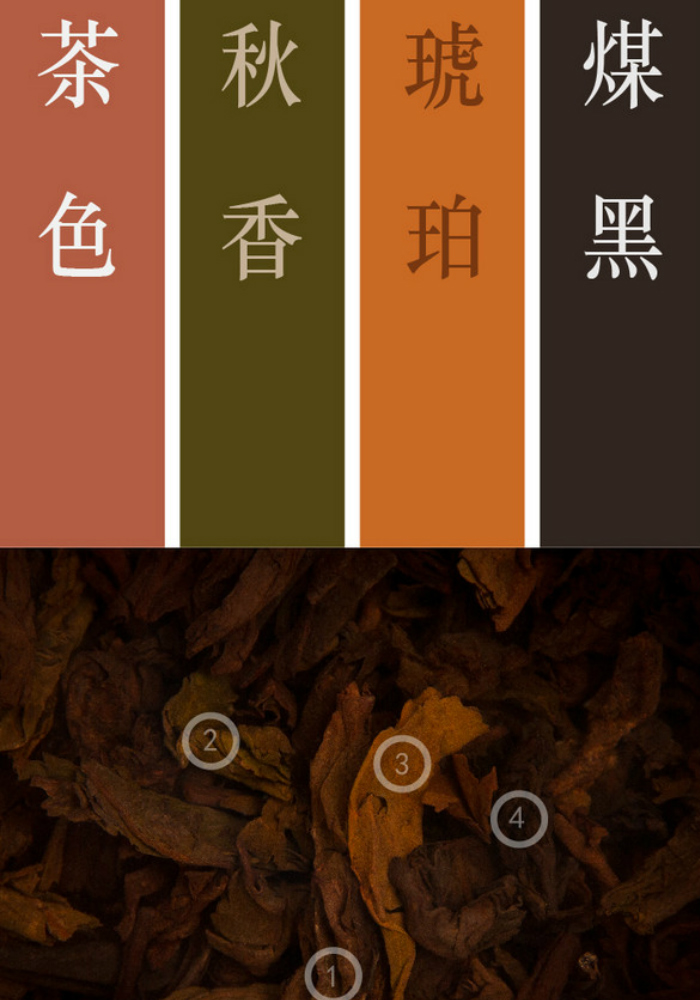 取色:虽然图中所示的熟普可能因为发酵的原因茶叶颜色偏深,但我们站在美学角度也是靠着火眼金睛薅出了其中的亮点。尤其是其中的酡红色,不仔细看还真看不出熟普的边缘有暖暖的红,还有叶片上些许的酡红色和棕色起到的提亮作用。