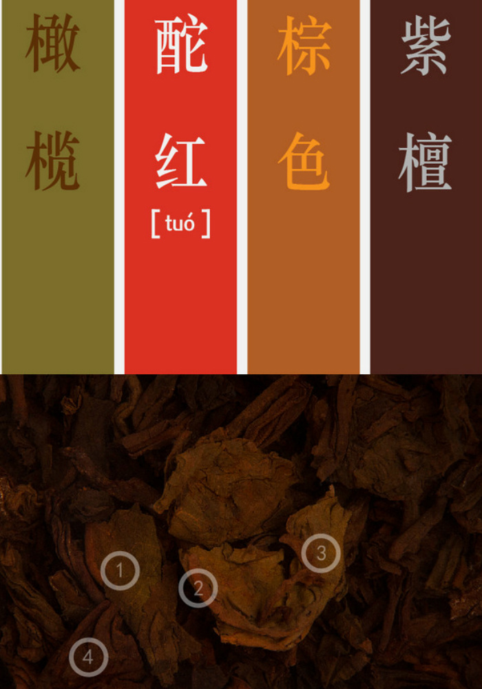 橄榄:熟普在发酵过程中,由于发酵程度不同而保留的更接近原茶的颜色。