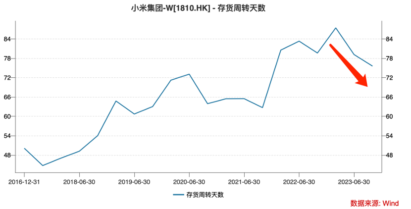 2022年堪称小米最困难的时刻,此时虽然企业一直不惜以牺牲毛利率的方式降ASP,但该时期内其库存周转天数仍然是上升的,也就是说尽管企业已经十分努力,库存总规模也在压缩中,但库存的周转效率却是恶化的。