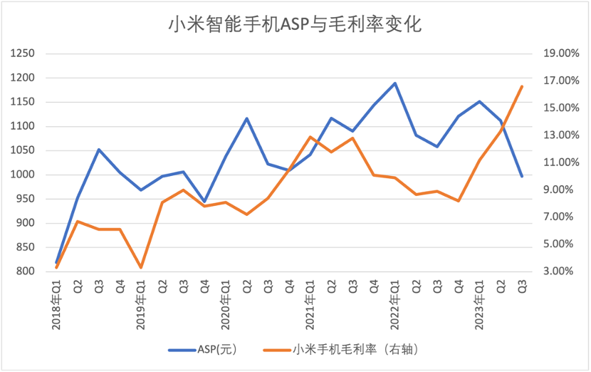 2023年Q3,小米智能手机以低ASP为策略提高了全球市占率(根据Canalys数据全球市占率达到14.1%,其中在欧洲达到了23.3%),在行业仍处于低迷状态时,该策略稳定了总需求。
