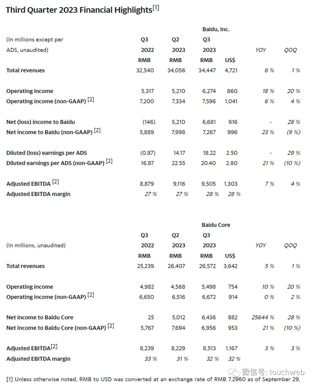 百度2023年第三季度经调整EBITDA为95亿元(13亿美元)及经调整EBITDA利润率为28%。百度核心的经调整EBITDA为85亿元(11.7亿美元)及百度核心的经调整EBITDA利润率为32%。