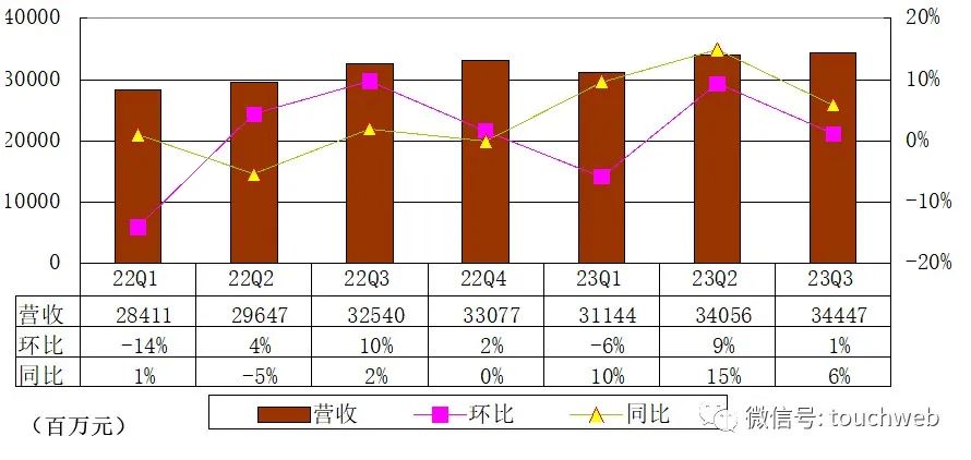 百度2023年第三季度营收达344.47亿元,较上年同期的325.4亿元增长6%,较上一季度的341亿元增长1%。
