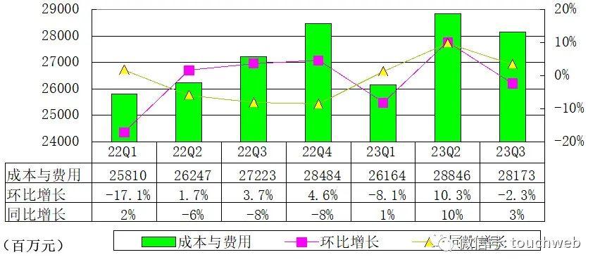 百度2023年第三季度成本与费用为281.73亿元,较上年同期的272亿元增长3%,较上一季度的288.46亿元下降2.3%。