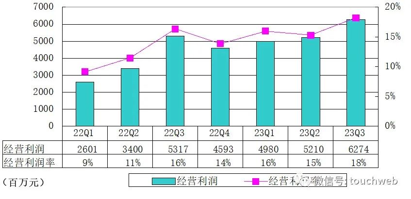 百度2023年第三季度经营利润为63亿元(8.6亿美元)。百度核心经营利润为55亿元(7.54亿美元),百度核心经营利润率为21%。