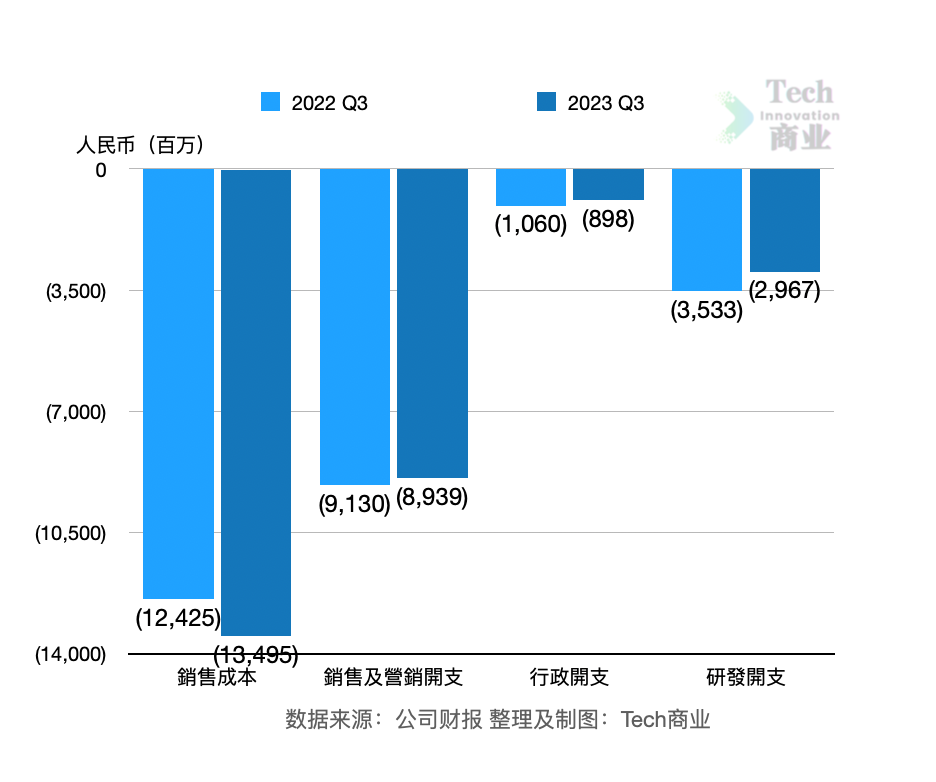 本财年Q3该公司销售及营销开支为89亿元,同比上一财年同期的91亿元,该项开支减少2%。最新季度行政开支为9.0亿元,相较上一财年同期的10.6亿元,该开支减少15%。本季度研发开支为29.7亿元,同比上一财年同期的35.3亿元,该开支减少16%。
