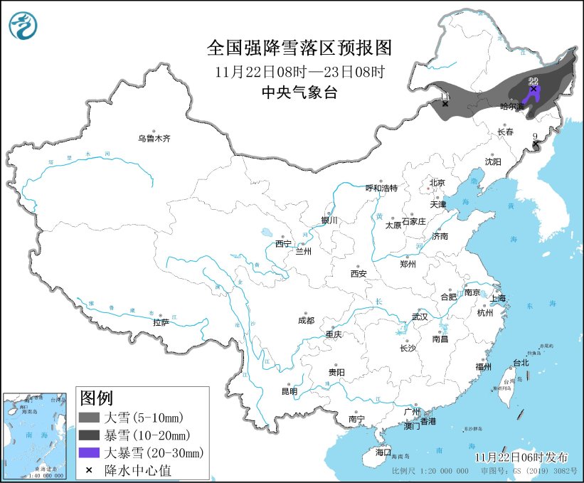 预计,11月22日08时至11月23日08时,内蒙古东部、黑龙江中东部、吉林北部和长白山区等地的部分地区有大到暴雪,其中,黑龙江中部局地有大暴雪(20~22毫米);上述地区新增积雪深度6~12厘米,局地可达16厘米以上。
