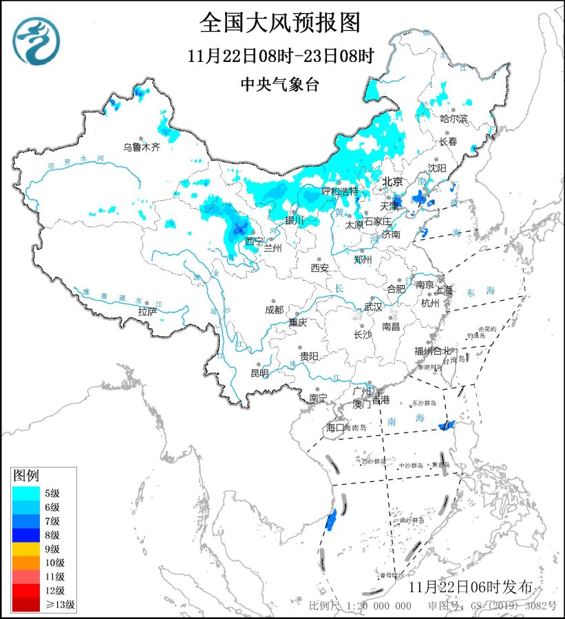 预计,11月22日08时至23日08时,内蒙古中西部、新疆北部、青海北部和东部、宁夏北部、陕西北部等地有5~6级、阵风7~8级的大风,局地阵风可达9级;渤海、渤海海峡、南海东北部和西南部海域、巴士海峡等部分地区将有7~8级、阵风9级的大风。