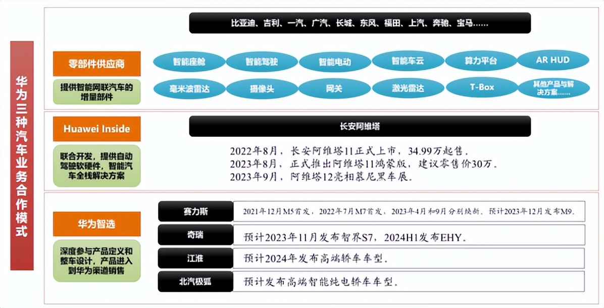 探析华为汽车产业链,绕不开华为在汽车业务上制定的商业模式,华为在国内汽车业务主要分为标准化的零部件模式、HI模式(Huawei Inside模式)、智选车模式三种商业模式。