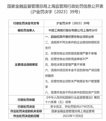 其中,单张处罚金额最高的罚单来自工商银行上海市分行。该行因为“超越权限开展经营性物业贷款业务”等8项违规,被“责令改正,并处罚款共计740万元”。