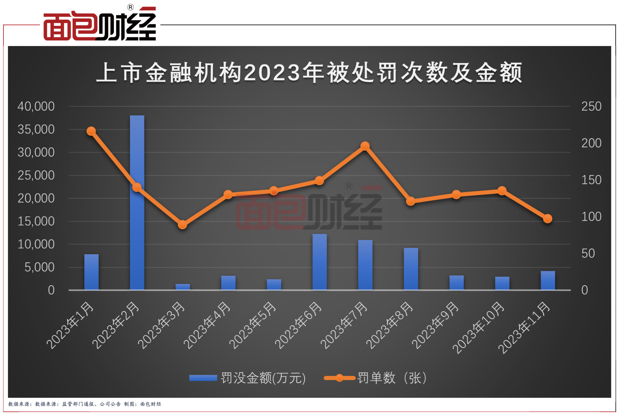 根据公开数据不完全统计,金融监管部门及其派出机构2023年以来截至11月19日,对国内上市金融机构共计开出张1538罚单,被罚没涉及金额合计达9.55亿元。