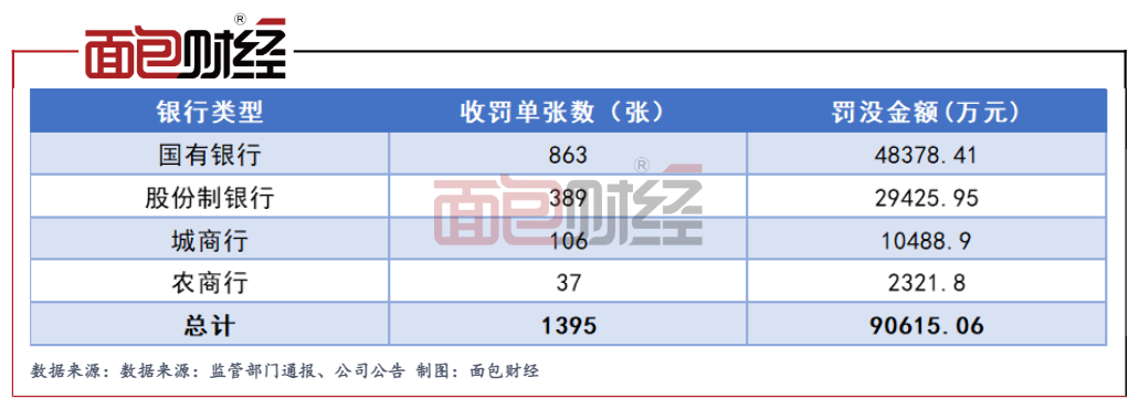 上市金融机构的大额罚单主要来自上市银行。统计数据显示,2023年以来,A股上市银行共计收到1395张罚单,合计罚款金额约为9.06亿元。